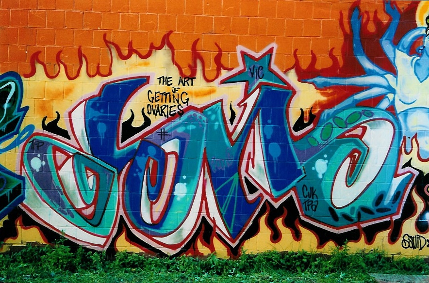 And I like that. As much as I didn’t “like” having “ovaries” in my title, or “female” for that matter—because those terms reduce down to a limited conception of these writers based on biology—the whole point of my project is to examine gender difference in graffiti subculture in a way that everyone can understand it, as much as possible. As any intro to gender and women’s studies student can tell you: sex and gender are not the same thing, but the fact of that matter is that sexual difference goes hand in hand with the experience of gender difference. And the writers I study all experience/respond to/navigate being read as “female” and “women” in one way, shape, or form. There’s just no escaping that fact. Knowing that too much jargon—either subcultural or academic—would limit my reach, I kept “female” for the general public and “getting ovaries” for the subcultural public.